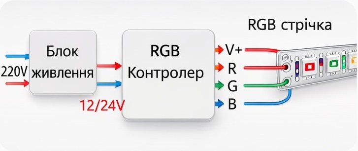 Приблизительно так: 220V → блок питания → контроллер → LED лента