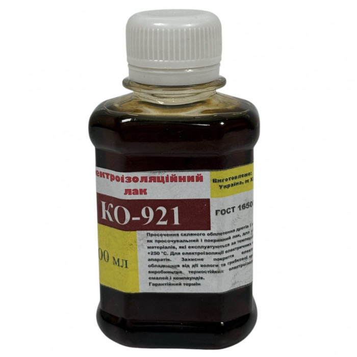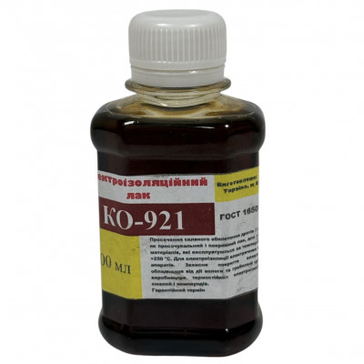 Электроизоляционный лак КО-921 – применяется для пропитки стеклянной оплетки проводов и кабелей, а также как пропиточный и покровный лак. Выдерживает температуру до 250°С. Используется для лакировки электротехнической стали, пропитки узлов электрических машин и аппаратов тропического, морского и оливостойкого исполнения. Также для термостойкого защитного покрытия печатных плат, микросхем. С помощью электроизоляционного лака изготавливаются провода со стекловолокнистой изоляцией, производят и ремонтируют электродвигатели (пропитка, изоляция якорей, роторов и статоров).