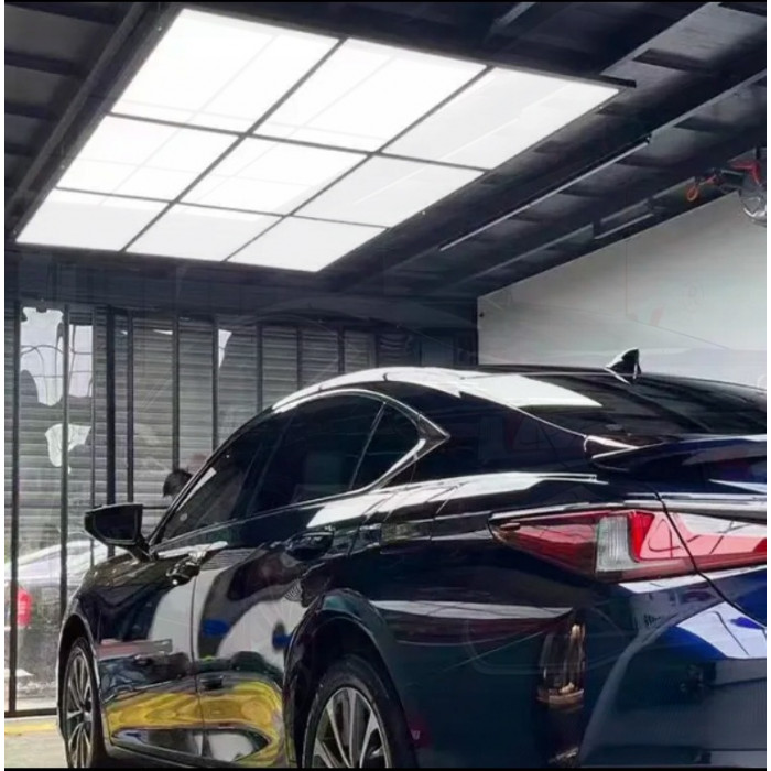 Светодиодный светильник для детейлинга мощностью 860 Вт предназначен для создания качественного и равномерного освещения в зонах полировки, покраски и визуального контроля. Система состоит из 9 модулей размером 1200×600 мм, которые вместе формируют большую световую поверхность 3600×1800 мм. Каждый модуль обеспечивает световой поток 10560 лм и излучает холодный белый свет с цветовой температурой 6500K. Матовый рассеиватель исключает мерцание и способствует мягкому распределению света без бликов.