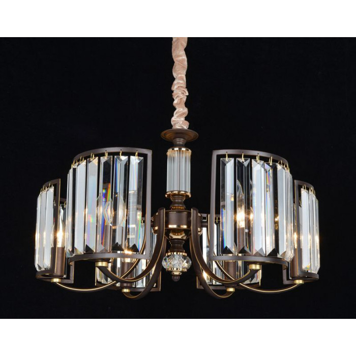 Сдержанная элегантность в темном металлическом каркасе с акриловыми подвесками, имитирующими хрусталь. Шесть ламп с цоколем E14 равномерно распределены внутри декоративного плафона, создавая мягкий, многогранный свет. Люстра подходит для гостиной, спальни или обеденной зоны – там, где важна атмосфера.
