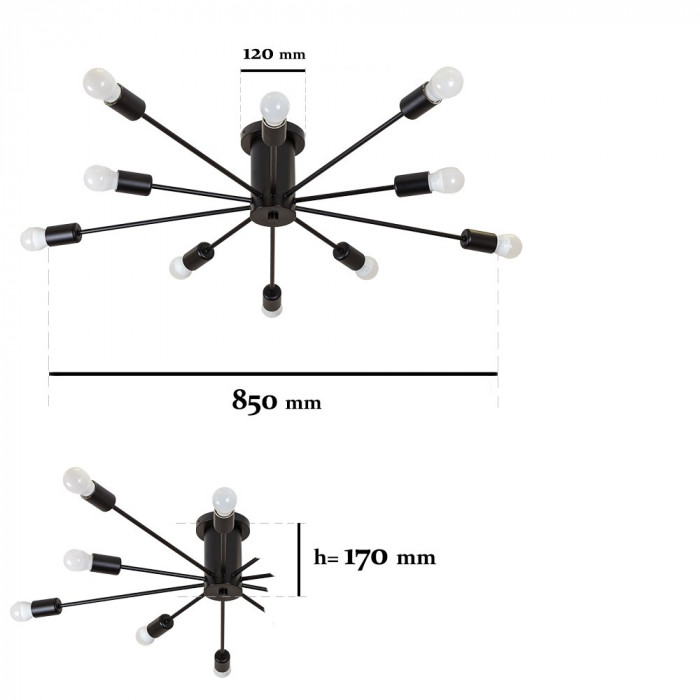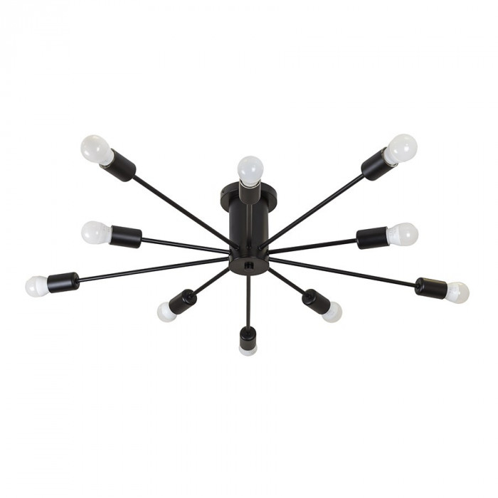 Источником света являются десять цоколей E27, совместимых с лампами накаливания, LED и энергосберегающими, с максимальной мощностью до 60 Вт на каждый плафон. Это обеспечивает яркое и равномерное освещение больших пространств. Центральная металлическая база диаметром 120 мм гарантирует надежную крепь и устойчивость конструкции.