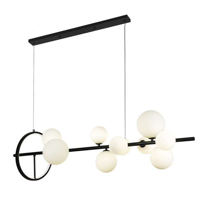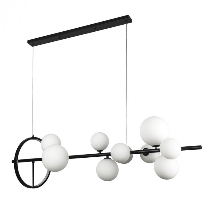 Современная подвесная люстра в черном и белом цветах сочетает металлический каркас с десятью стеклянными плафонами разных диаметров – 100, 120 и 150 мм. Такая комбинация создает эффектный ритм и придает интерьеру динамику. Горизонтальная конструкция размером 1200×300 мм дополнена декоративным кольцом, что придает люстре архитектурный и скульптурный вид.