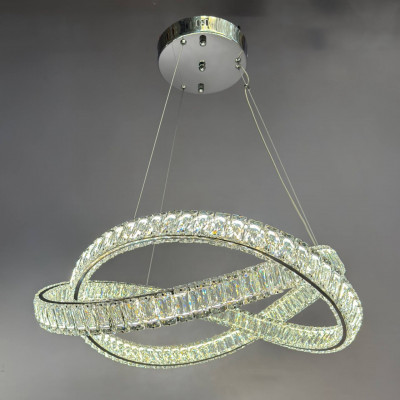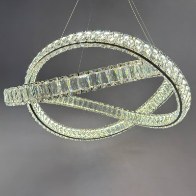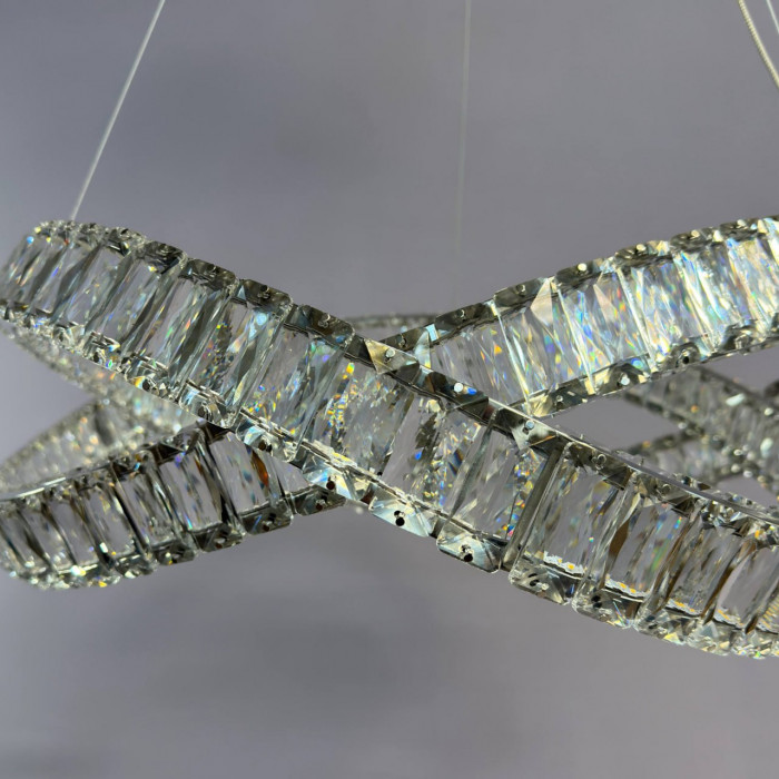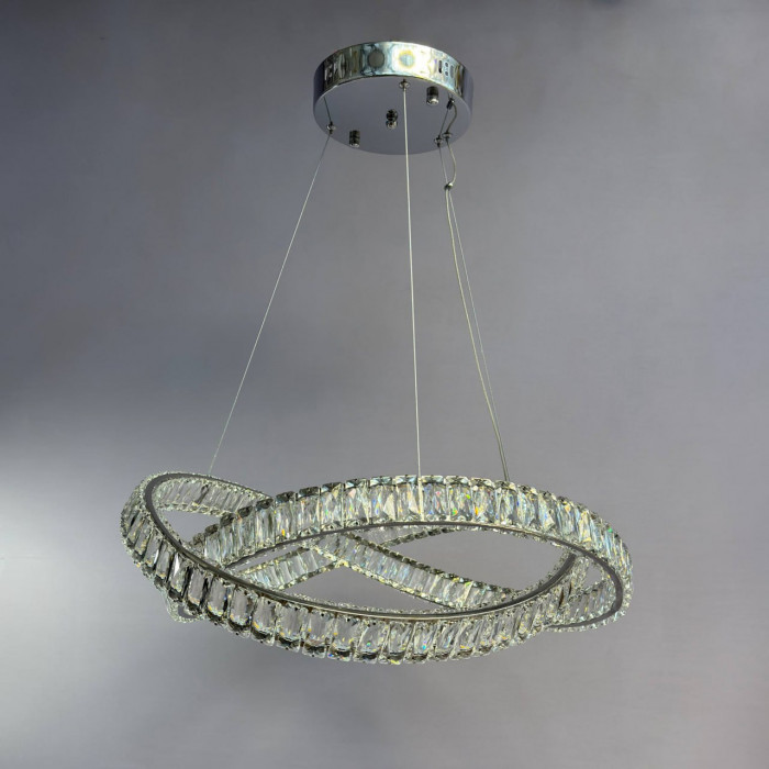 Современная подвесная люстра в хромовом исполнении с хрустальным декором – идеальное решение для освещения просторных помещений площадью 17–20 м². Элегантное переплетение геометрических форм придает люстре объемности и эффектности, превращая ее в стильный акцент любого интерьера. Конструкция выполнена из высококачественного металла и прозрачного хрусталя, что обеспечивает яркое и сияющее освещение.