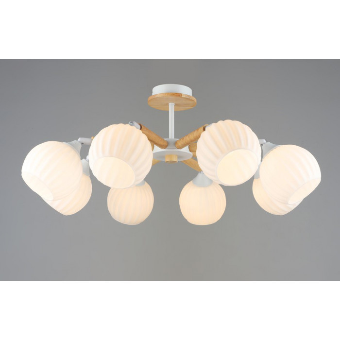Эта потолочная люстра – восемь источников света, объединенные в гармоничную композицию белого металла и теплых деревянных акцентов. Ее геометрия проста, но выразительна: плафоны расположены равномерно, создавая сбалансированное освещение для просторных комнат. Белый каркас с натуральными вставками придает интерьеру легкость, а металлические плафоны — современный характер.
