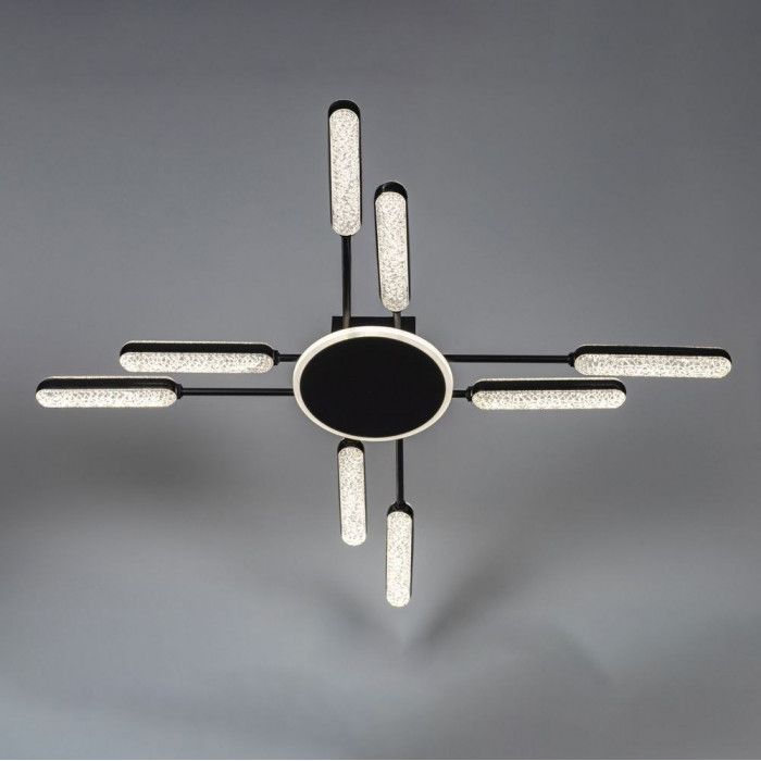 Современная потолочная люстра 132Вт с черным металлическим каркасом и девятью изящными световыми элементами. Ее стильный минималистический дизайн гармонично сочетает строгость металла и эффектное сияние кристаллообразных рассеивателей, создающих мягкое равномерное освещение. Благодаря большому диаметру (84 см) светильник выглядит выразительно и станет акцентом в любом интерьере – от современной гостиной до просторной спальни.