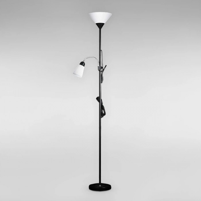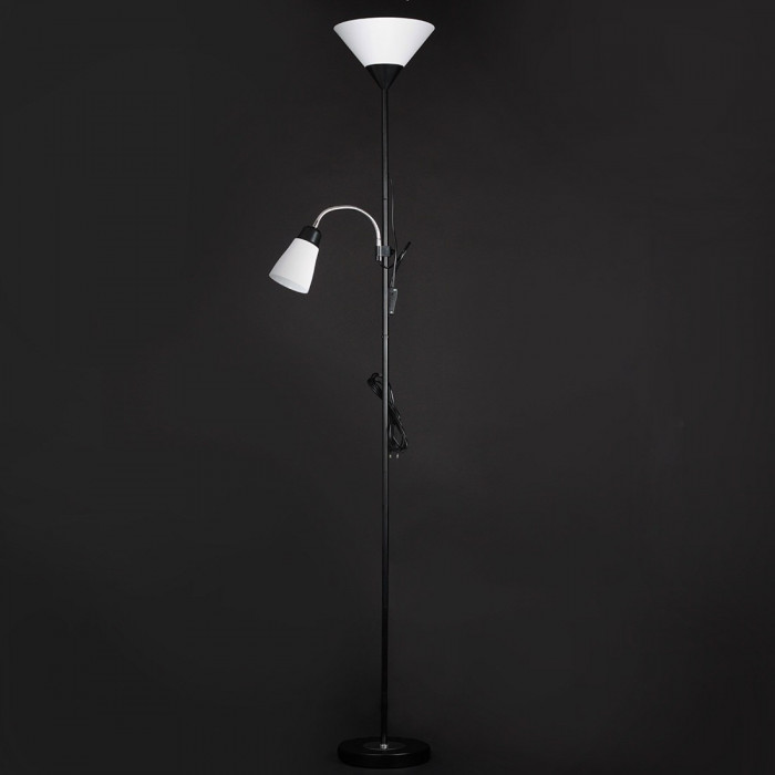 Каркас изготовлен из прочного металла и выполнен в черном цвете, а плафоны из легкого и практичного пластика. Торшер использует стандартные патроны E27 для верхнего светильника и E14 для бокового, что позволяет подобрать наиболее подходящие лампы мощностью до 60 Вт. Управление осуществляется с помощью удобной кнопки на шнуре, что обеспечивает легкость включения даже в темноте.