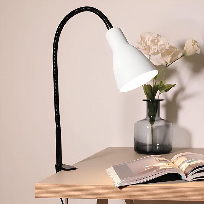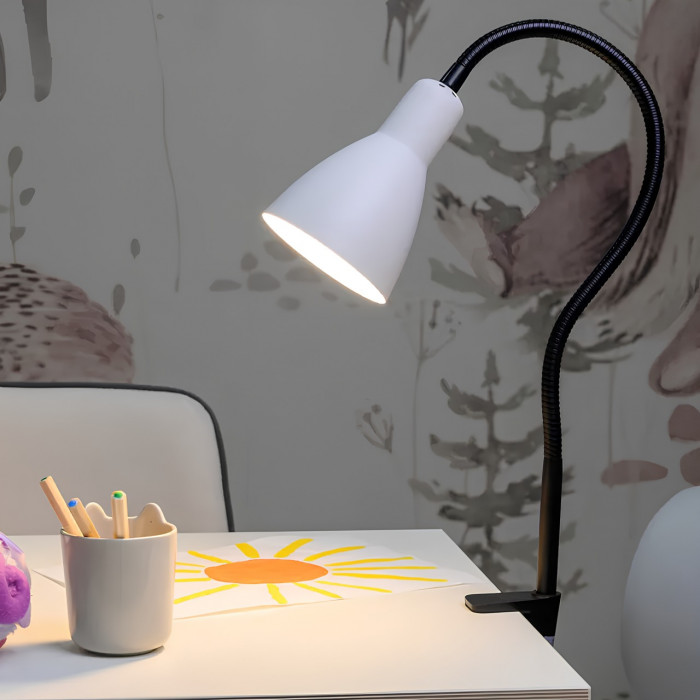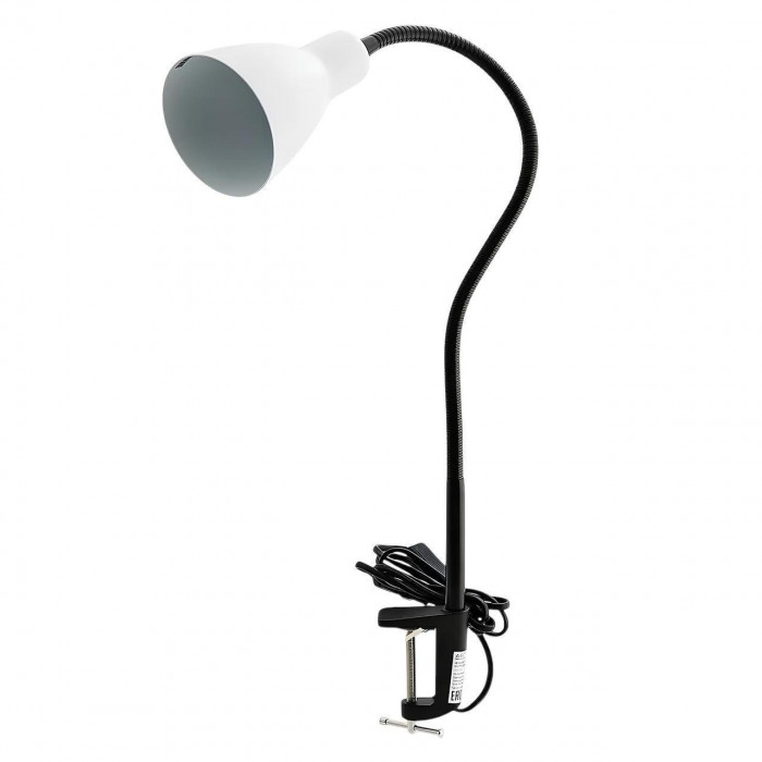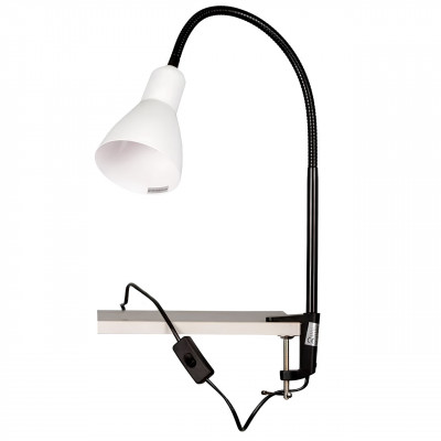 Белая настольная лампа с металлическим плафоном и гибкой конструкцией – идеальное решение для рабочего места, мастерской или учебного пространства. Благодаря надежному струбцинному креплению она легко фиксируется на край стола, оставляя максимум свободной поверхности. Длина 68 см позволяет точно настроить направление света, а диаметр плафона 11 см обеспечивает концентрированное освещение без рассеяния.