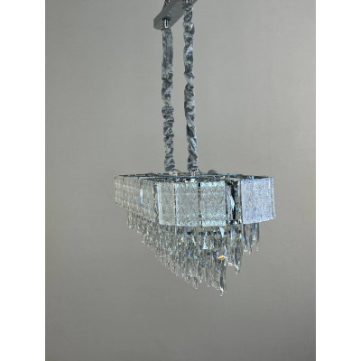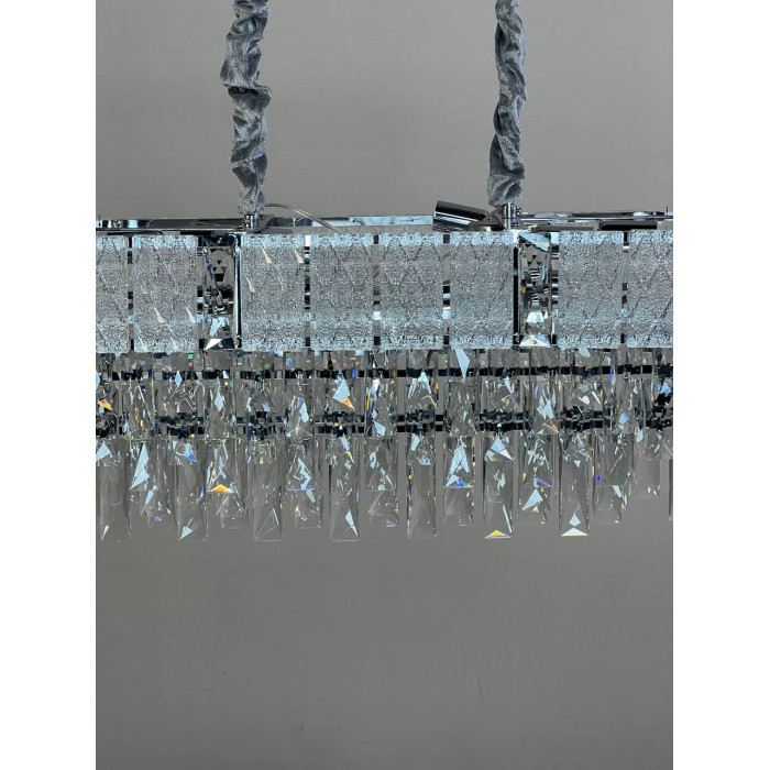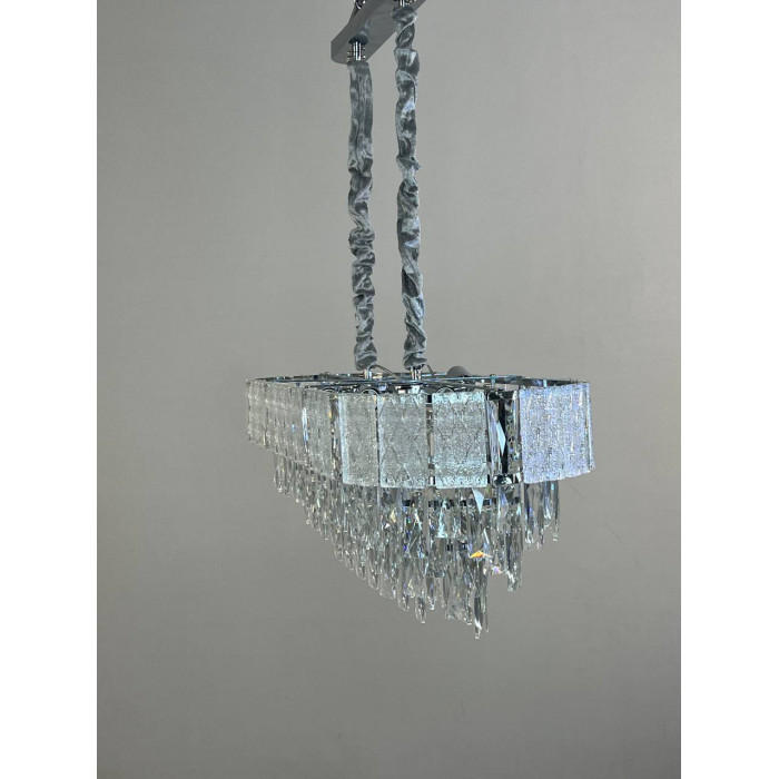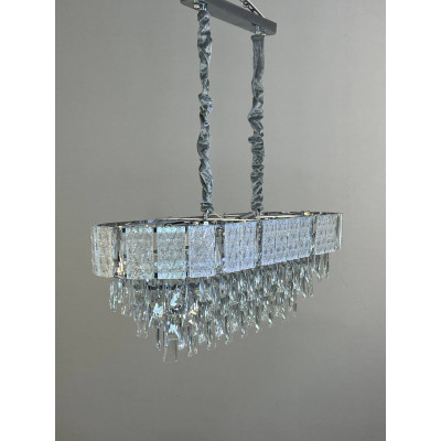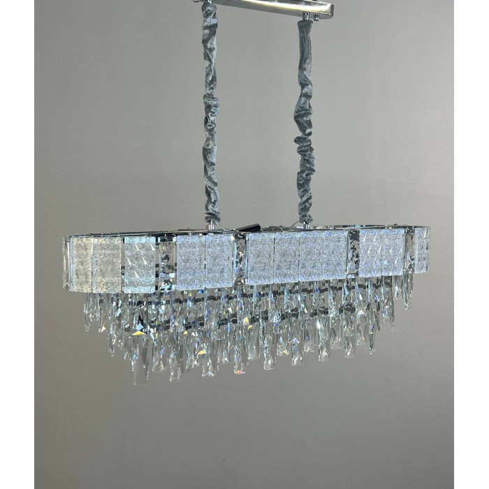 Эта модель – воплощение современной элегантности. Овальная форма, четкие линии и многоуровневая композиция из стеклянных подвесок создают эффект каскада, который не просто освещает пространство, а формирует его атмосферу. Металлический каркас с гальваническим покрытием обеспечивает долговечность и визуальную глубину, а прозрачные стеклянные элементы эффектно преломляют свет, придавая интерьеру динамики.