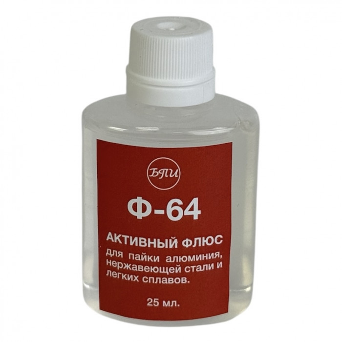Флюс Ф-64 – идеальный выбор для пайки алюминия и легких сплавов. Обеспечивает легкую пайку без предварительной зачистки поверхности, имеет цвет от светло-коричневого до буро-коричневого, активен в температурном интервале от 180 до 350 С. Состав включает в себя ТЭА, фториды, ингибиторы коррозии, смачивающие присадки и деионизированную воду. Делает пайку алюминия так же простой, как канифольный флюс для меди.