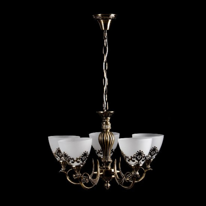 Эта модель – не просто источник света, а композиционный центр комнаты. Пять стеклянных плафонов с матовым покрытием равномерно рассеивают свет, создавая спокойное теплое освещение без лишнего блеска. Они расположены на изящных бронзовых кронштейнах, которые плавно изгибаются, формируя симметричную, сбалансированную конструкцию.