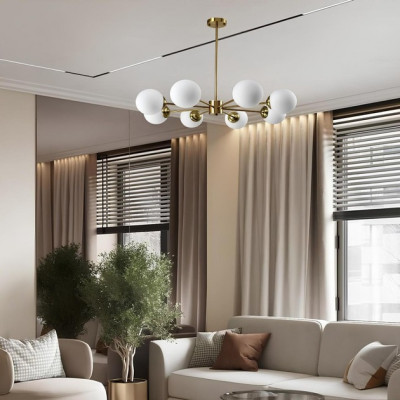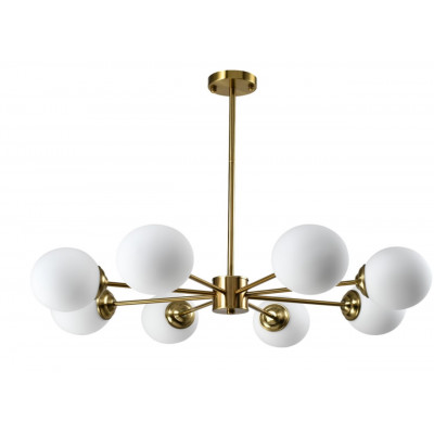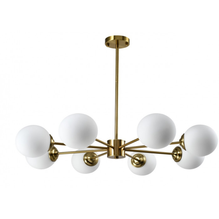 Каркас из металла золотого цвета создает атмосферу тепла и изысканности, а плафоны из матового стекла дарят мягкий, уютный свет, не слепящий глаза. Такой тандем материалов – золото + стекло – визуально "поднимает" потолок и придает простору глубины. Люстра оборудована 8 патронами типа E27, совместимыми с LED-лампами, энергосберегающими и классическими лампами накаливания.