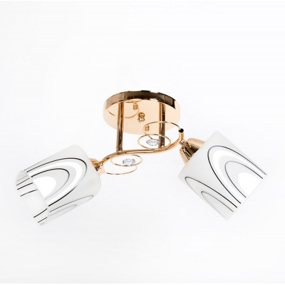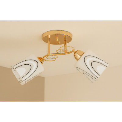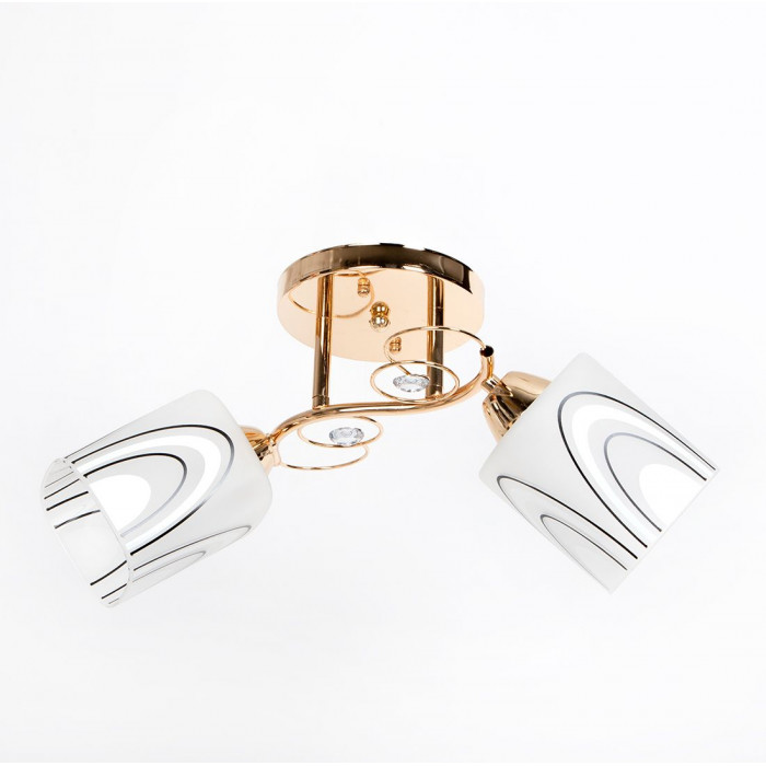 Эта изящная потолочная люстра – выбор для тех, кто ценит современный дизайн с ноткой роскоши. Золотой металлический каркас с плавными линиями и декоративными кристаллами придает интерьеру тепла и изысканность, а два стеклянных плафона с графическим орнаментом создают мягкое, комфортное освещение без резких теней.