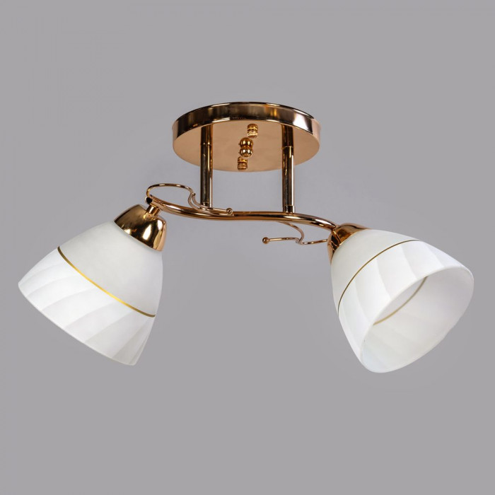 Потолочный светильник на два источника света – идеальное решение для зонального освещения. Благодаря патронам E27, он поддерживает различные типы ламп, включая LED и энергосберегающие. Золотой металлический каркас придает интерьеру тепла, а стеклянные плафоны обеспечивают равномерное светорассеяние. Монтаж на планку – быстрый и надежный, а компактные размеры позволяют использовать модель в спальне, коридоре, кухне или кабинете.