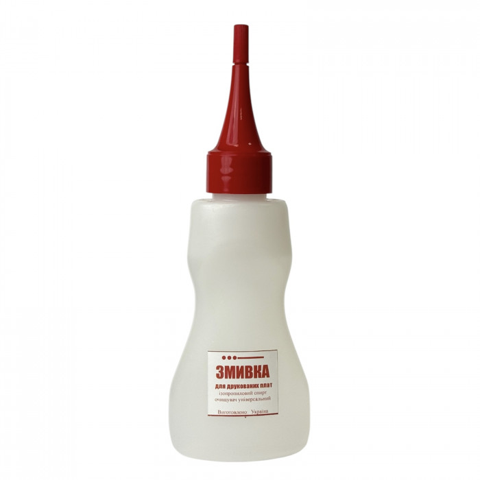 В её состав входит абсолютный изопропиловый спирт. (содержание воды и других примесей в ней не превышает 0,5%) и бензина Калоша. При обработке платы спирт смывает остатки флюса (канифоли), а бензин Калоша – остатки продуктов горения, образующиеся после пайки.