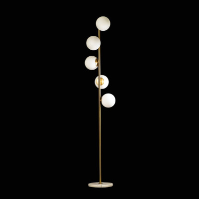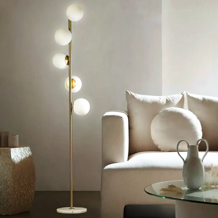 Этот стильный напольный торшер на пять плафонов станет акцентным элементом интерьера и практическим источником света. Конструкция сочетает современную эстетику и продуманную функциональность – каждый из стеклянных матовых плафонов диаметром 14 см обеспечивает мягкое и равномерное рассеяние света, создавая приятную атмосферу в любой комнате.