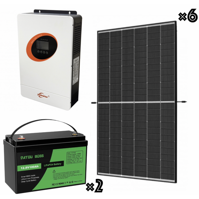 Этот комплект резервного электропитания идеально подходит для установки в частных домах, а также на объектах малого бизнеса. В состав системы входят шесть монокристаллических солнечных панелей мощностью по 445 Вт каждая, гибридный инвертор на 24 В с номинальной мощностью 3600 Вт, а также два литий-железо-фосфатных аккумулятора LiFePO₄ емкостью 12 В 120 Ач ( 2560Вт общая емкость).