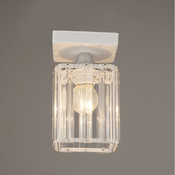 Потолочный светильник на один источник света – элегантное решение для зонального или акцентного освещения. Металлический каркас белого цвета дополнен вертикальными стеклянными вставками, которые создают эффект призмы и мягко рассеивают свет. Патрон типа E27 позволяет использовать светодиодные, энергосберегающие или лампы накаливания мощностью до 60 Вт. Габариты: ширина – 10 см, высота – 17 см. Крепление к потолку осуществляется на планку, тип выключателя – настенный, степень защиты IP20. Светильник идеально подходит для коридоров, гардеробных, небольших комнат или в качестве дополнительного источника света в зоне акцента.