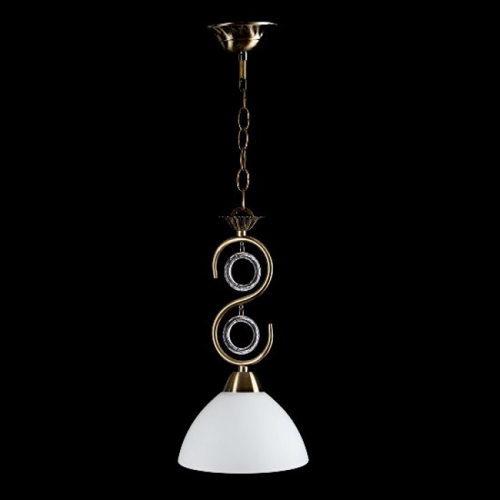 Компактный подвесной светильник на один источник света – идеальное решение для зонального освещения. Металлический каркас в бронзовом цвете сочетается со белым стеклянным плафоном диаметром 17 см, создавая мягкий, рассеянный свет. Изящный декоративный элемент над плафоном придает изделию характер и визуальную глубину.