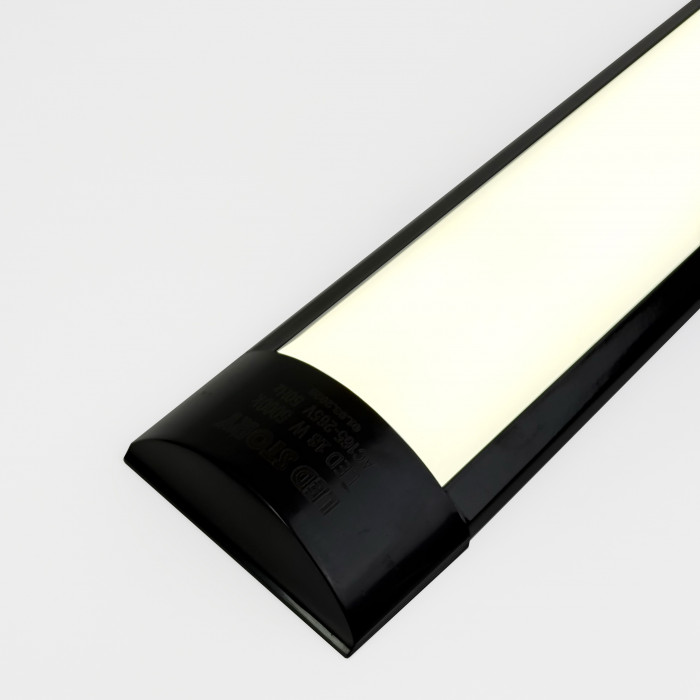 Линейный LED светильник мощностью 18Вт обеспечивает равномерное освещение помещений средней площади. Цвет свечения – белый естественный (5000К), световой поток составляет 1800 лм, что гарантирует комфортную видимость без перенапряжения глаз. Длина корпуса – 600 мм, напряжение питания – 175–265V, степень защиты – IP20. Корпус изготовлен из окрашенного металла черного цвета, рассеиватель поликарбонатный матовый.