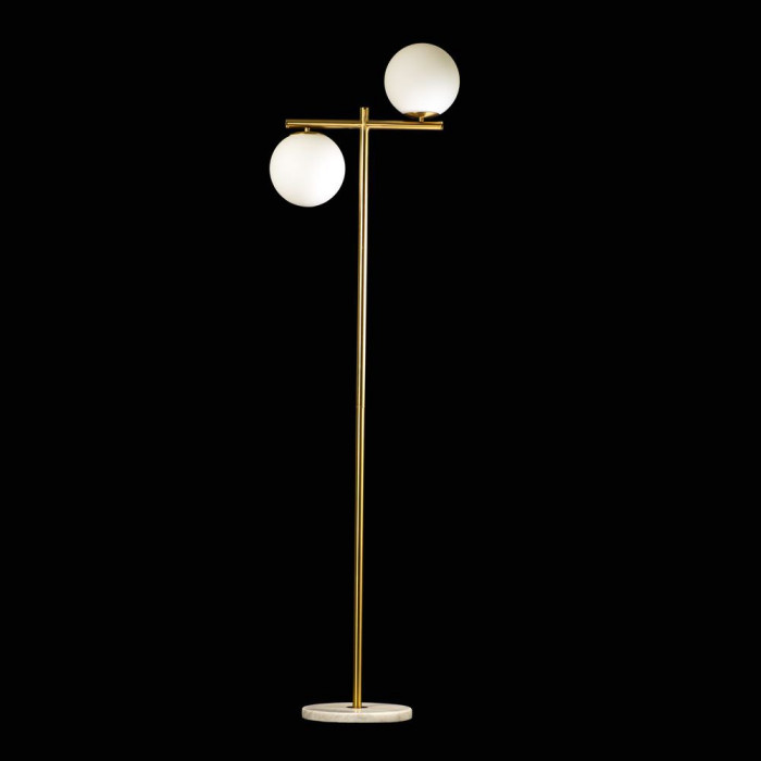 Каркас изготовлен из металла с матовым золотистым покрытием, что гармонично сочетается с двумя плафонами из белого матового стекла (по 18 см в диаметре). Важное преимущество – стабильное основание из натурального камня, которое придает элегантности и обеспечивает надежность и безопасность. Торшер имеет высоту 160 см и ширину 42 см – оптимальные параметры для гостиной, спальни, домашнего кабинета или офиса.