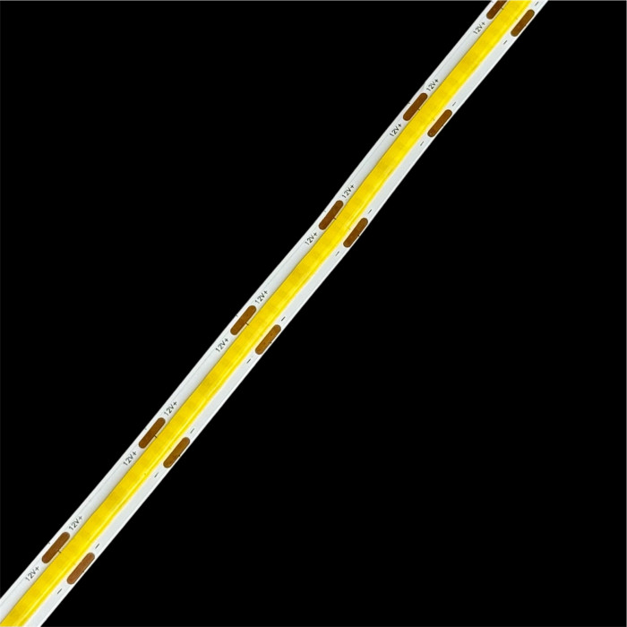 Основное преимущество данной ленты состоит в том, что она изготовлена на основе COB диодов. Данная технология производства лент обеспечивает возможность размещения большого количества LED элементов на одном погонном метре изделия. Они размещаются в едином корпусе, что в совокупности со сплошным покрытием люминофором обеспечивает сплошное равномерное свечение по всей длине ленты. Точки, как в полосах на основе SMD кристаллов, полностью отсутствуют.