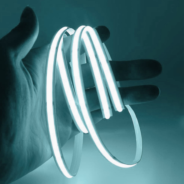 Светодиодная COB лента с холодным белым светом – это современное решение для яркого и равномерного освещения без видимых точек светодиодов. Благодаря технологии COB (Chip On Board) свет смотрится сплошной линией, что обеспечивает аккуратный и профессиональный внешний вид подсветки.