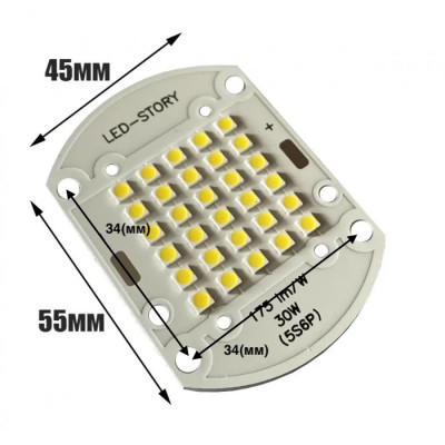 Светодиодная матрица 30W предназначена для применения в уличных светильниках светодиодных прожекторах и других источниках света. В светодиодной матрице установлено 30 диодов, максимальной мощностью 1,5W , светоотдачей 175lm/W, на которые их производитель дает нам 10 лет гарантии (5 из них на невыгорание светопотока). Светодиодная матрица 30W – это компактный и простой в монтаже модуль, НОВОГО ПОКОЛЕНИЯ, чипы его отлично работают в повышенных температурных режимах,благодаря тройному ЗОЛОТОМУ проводнику,который связывает каждый чип. Светодиоды размещены на высококачественной алюминиевой подложке, которая эффективно отводит тепло от кристаллов. Кристаллы соединены между собой последовательно. С помощью люминофора создается цветовая температура 5000К (белый свет). Для подключения данного светодиодного изделия, используется специальный драйвер 30 Вт. При монтаже модуля обязательно соблюдайте полярность "+" и "-" обязательное использование дополнительного радиатора для отвода тепла.