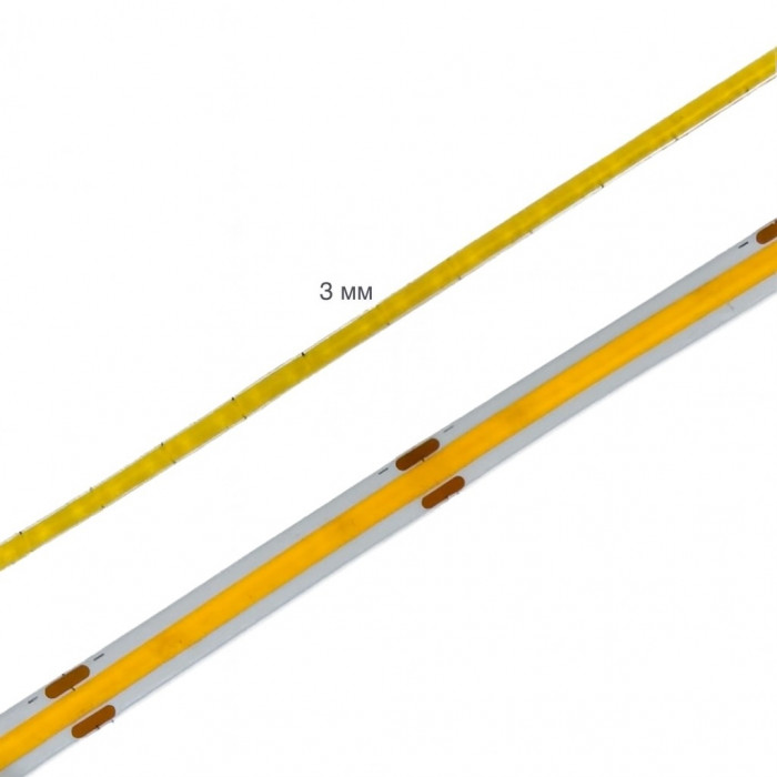 Благодаря технологии COB (Chip on Board) на ней можно разместить гораздо большее количество диодов на погонный метр изделия, что позволяет создавать сплошную световую линию. Диоды размещаются в едином корпусе. Все это вместе с дополнительным покрытием кристаллов цельным слоем люминофора обеспечивает равномерное и мягкое свечение по всей длине ленты. Точки, как в случае с SMD лентами, полностью отсутствуют. Такая лента имеет срок службы не менее 50 000 часов и не перегревается за счет крепления кристаллов непосредственно на печатной плате.