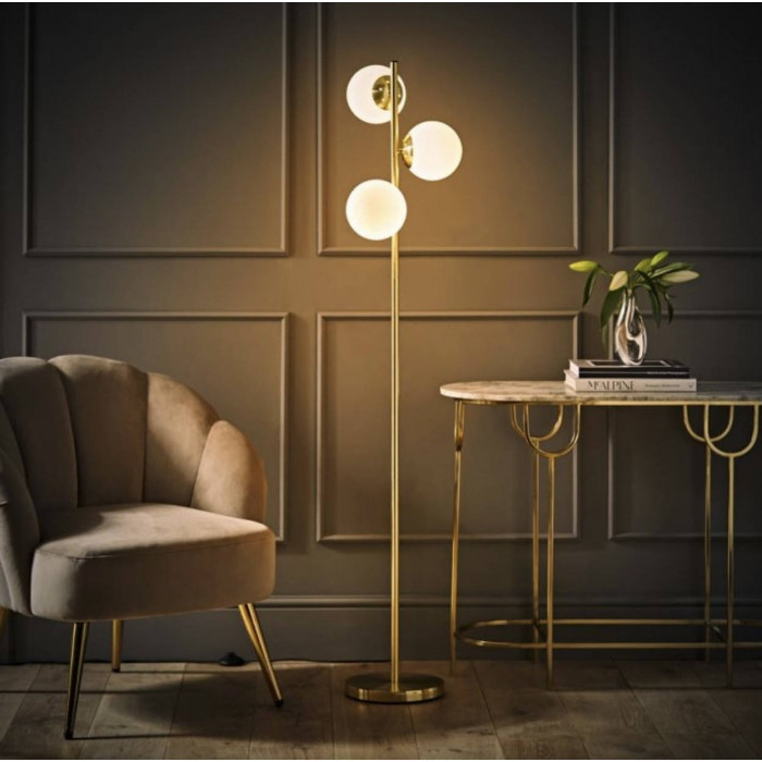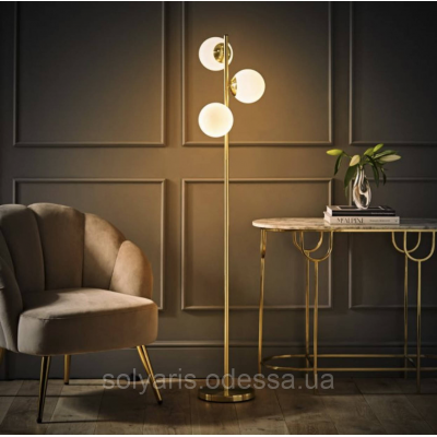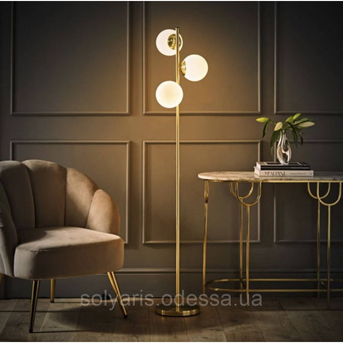 Каркас изготовлен из металла благородного золотого цвета, что придает светильнику элегантность и визуальное тепло. Основание из натурального камня гарантирует устойчивость конструкции и подчеркивает премиальность модели. Матовые стеклянные плафоны (диаметром 14 см) рассеивают свет равномерно, создавая уютную атмосферу для отдыха или работы.