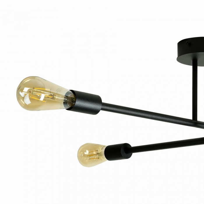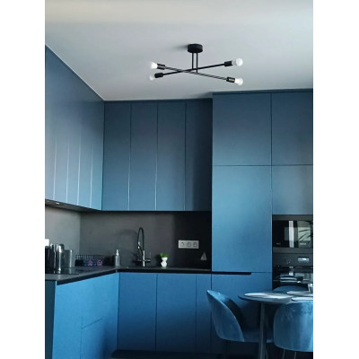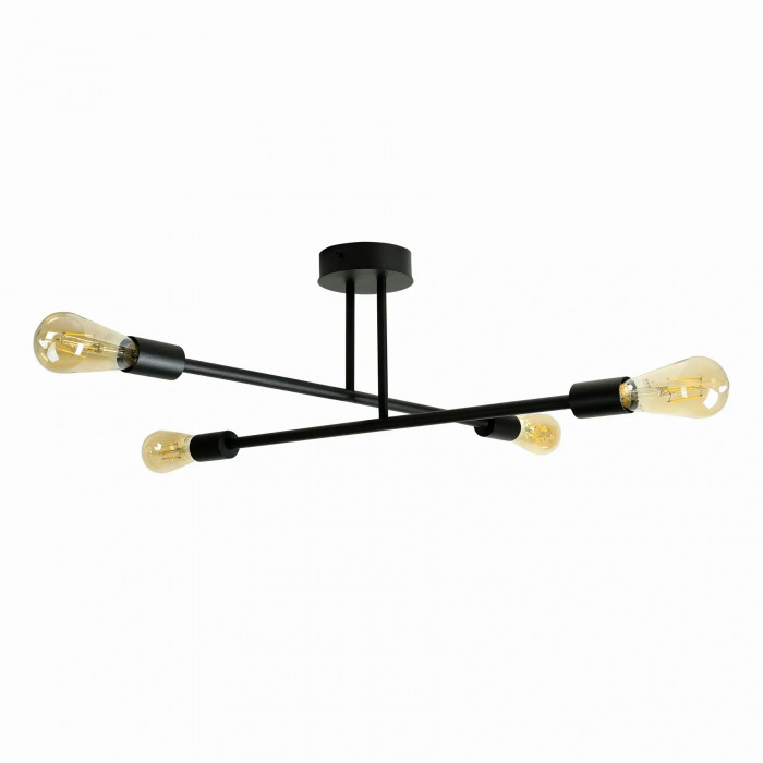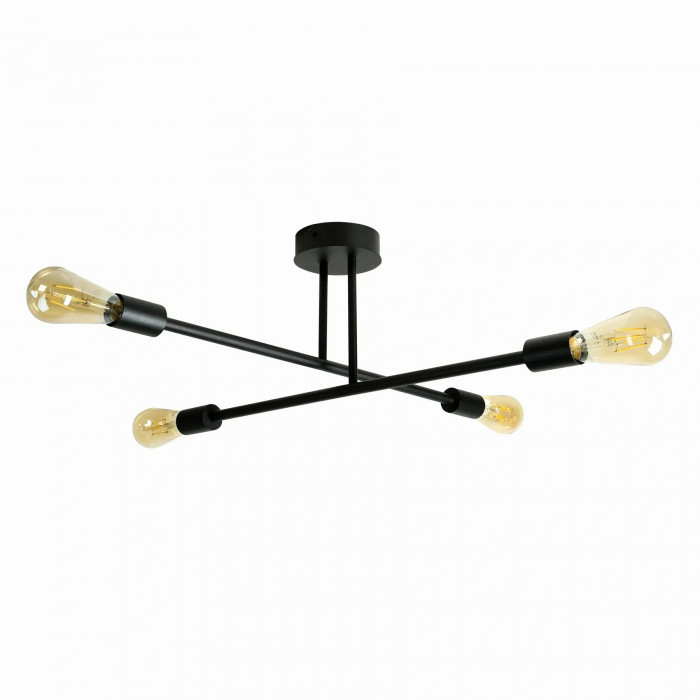 Стельова люстра на 4 лампи з цоколем E27 у чорному кольорі — це стильний та лаконічний світильник із виразним індустріальним характером. Від центральної основи відходять дві металеві штанги, що формують симетричну геометричну конструкцію, на кінцях якої розташовані відкриті патрони без плафонів. Такий дизайн залишає повну свободу у виборі типу ламп — теплих, яскравих LED, філаментних чи будь-яких інших із потужністю до 60 Вт кожна.