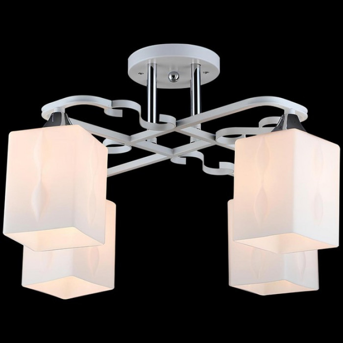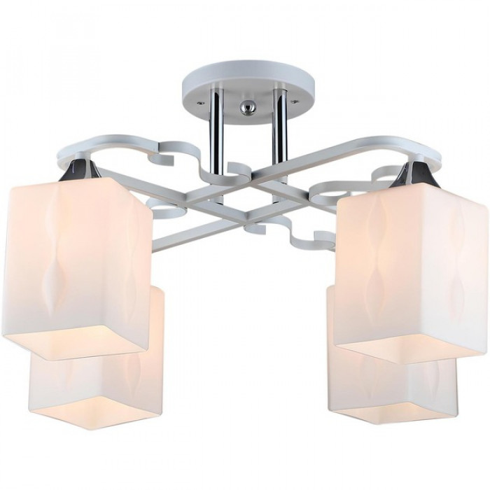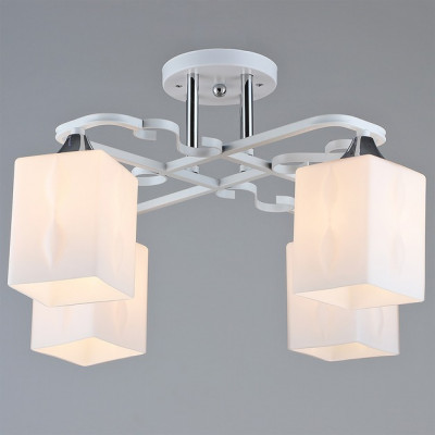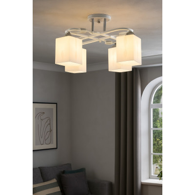 Ця стельова люстра на чотири плафони — не просто джерело освітлення, а геометричний акцент, що додає інтер’єру ритму й балансу. Білий металевий каркас із симетричним дизайном виглядає лаконічно, але виразно, а скляні плафони з хвилястою текстурою м’яко розсіюють світло, створюючи теплу, затишну атмосферу.