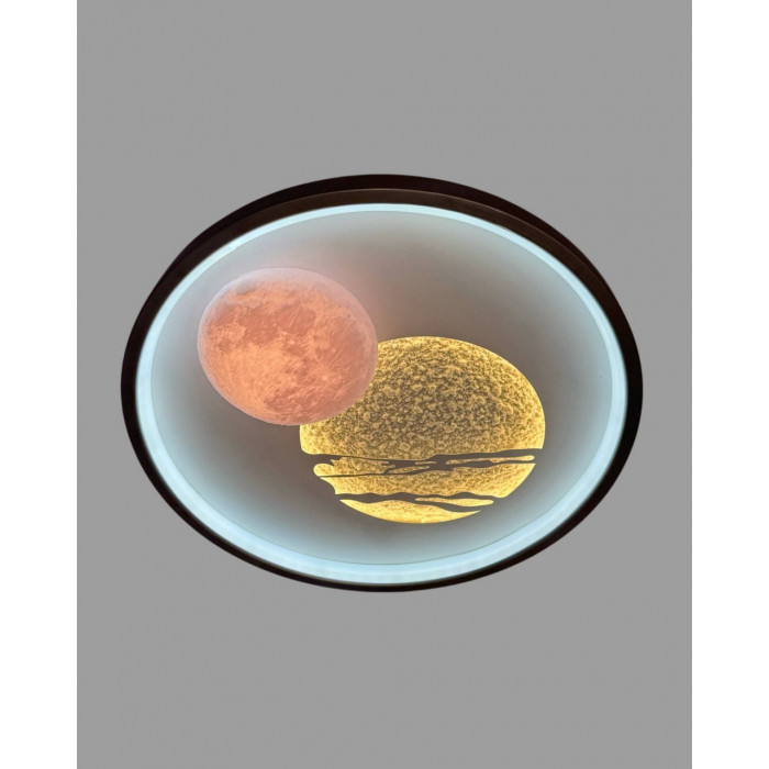 Сучасний стельовий світильник із декоративним оформленням у вигляді двох планет — стильне та функціональне рішення для освітлення приміщень площею 7–10 м². Поєднання металу й акрилу забезпечує привабливий зовнішній вигляд, міцність конструкції та довгий термін служби. Завдяки компактним розмірам (висота — 7 см, ширина — 30 см), світильник ідеально підходить для кімнат з невисокими стелями: спальні, дитячої, кухні або передпокою.
