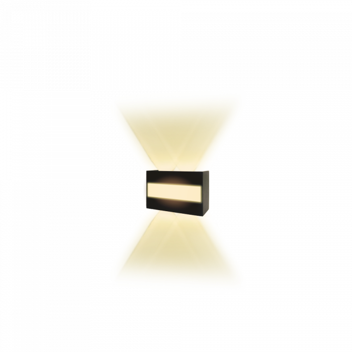 Цей світильник — як штрих у вечірній архітектурі. Його прямокутна форма з центральною світловою панеллю створює чіткий симетричний малюнок на стіні: тепле світло розходиться вгору і вниз, формуючи V-подібні промені, які підкреслюють фактуру фасаду.