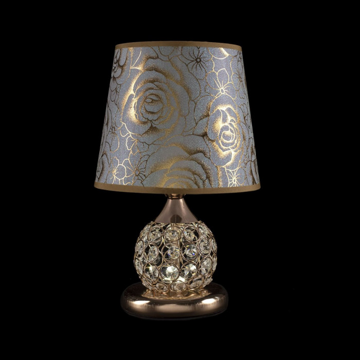 Настільна лампа в золотому кольорі з текстильним абажуром — розкішний акцент для інтер’єру в класичному стилі. Абажур прикрашений флористичним візерунком у теплих золотистих тонах, що додає виробу елегантності та декоративної глибини. Основа лампи — металевий корпус із глянцевим покриттям, декорований кристалічними елементами, які красиво переливаються при освітленні. Вбудована LED-підсвітка в основі створює м’яке фонове світло, а основне джерело — лампа з цоколем E27 — забезпечує комфортне освітлення.