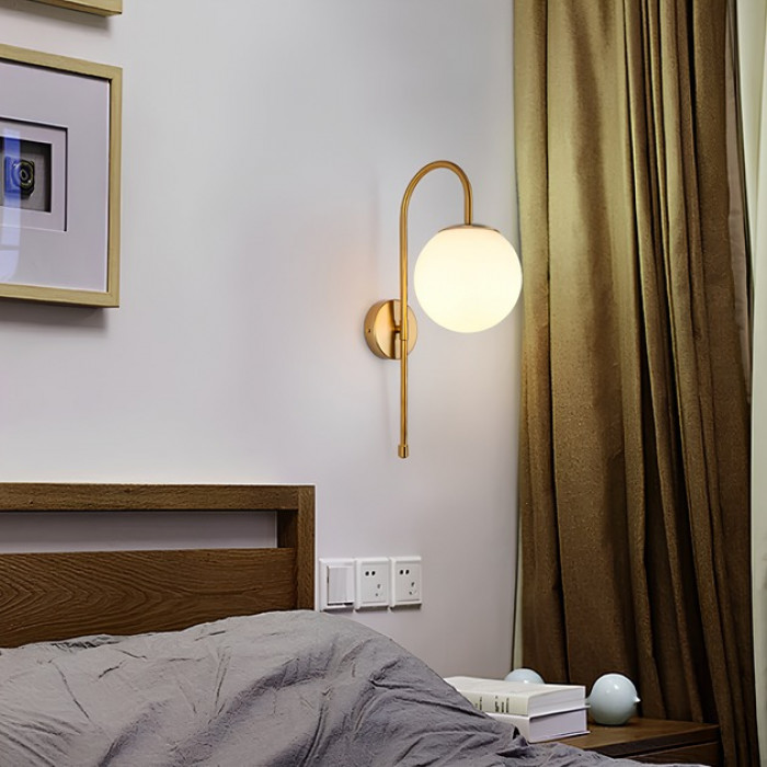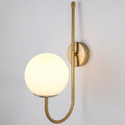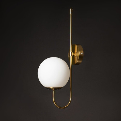 Це настінне бра — витончене поєднання вертикальної елегантності та світлової гармонії. Його плавна металева арка золотого кольору підтримує скляний плафон, що нагадує світлову сферу, — делікатну, але виразну. Такий дизайн додає простору ритму й глибини, не перевантажуючи інтер’єр.