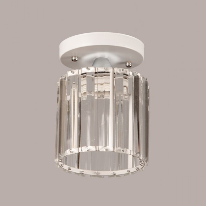 Стельовий світильник на одне джерело світла з металевим каркасом білого кольору та вертикальними скляними вставками має циліндричну форму. Завдяки прозорим елементам плафона світло рівномірно розсіюється, створюючи м’яке освітлення з декоративним ефектом. Патрон E27 підтримує світлодіодні, енергозберігаючі та лампи розжарювання потужністю до 60 Вт. Габарити: ширина — 13 см, висота — 17 см. Кріплення до стелі на планку, тип вимикача — настінний, ступінь захисту IP20. Ідеально підходить для коридорів, гардеробних, невеликих кімнат або зонального освітлення.