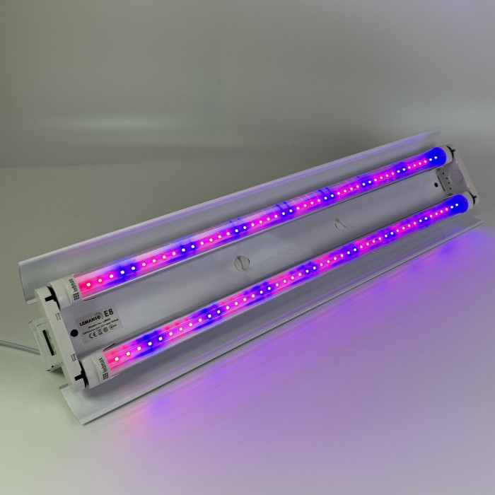 Головна перевага цього комплекту — спеціалізоване освітлення для рослин. У світильник встановлюються дві LED фітолампи з червоно-синім спектром, який сприяє активному фотосинтезу та здоровому розвитку рослин. Червоний спектр стимулює ріст, цвітіння та формування плодів, а синій допомагає зміцнювати кореневу систему та формувати густу крону. Таке поєднання світла створює оптимальні умови для розсади, кімнатних рослин, зелені або міні-теплиць у періоди нестачі природного освітлення.
