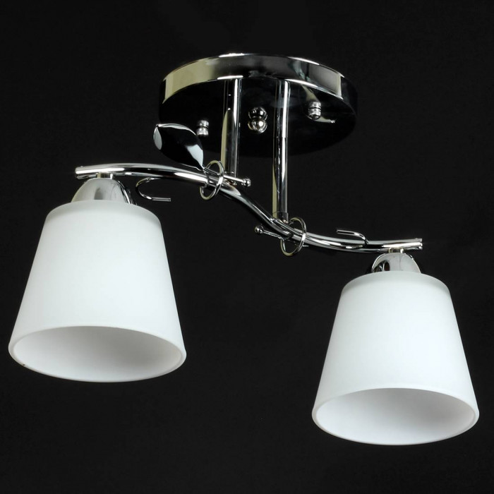Ця сучасна стельова люстра — ідеальний вибір для тих, хто цінує лаконічний дизайн і чисте світло в інтер’єрі. Хромований металевий каркас із плавними лініями виглядає стримано й елегантно, а два матові скляні плафони м’яко розсіюють світло, створюючи комфортну атмосферу без різких тіней.