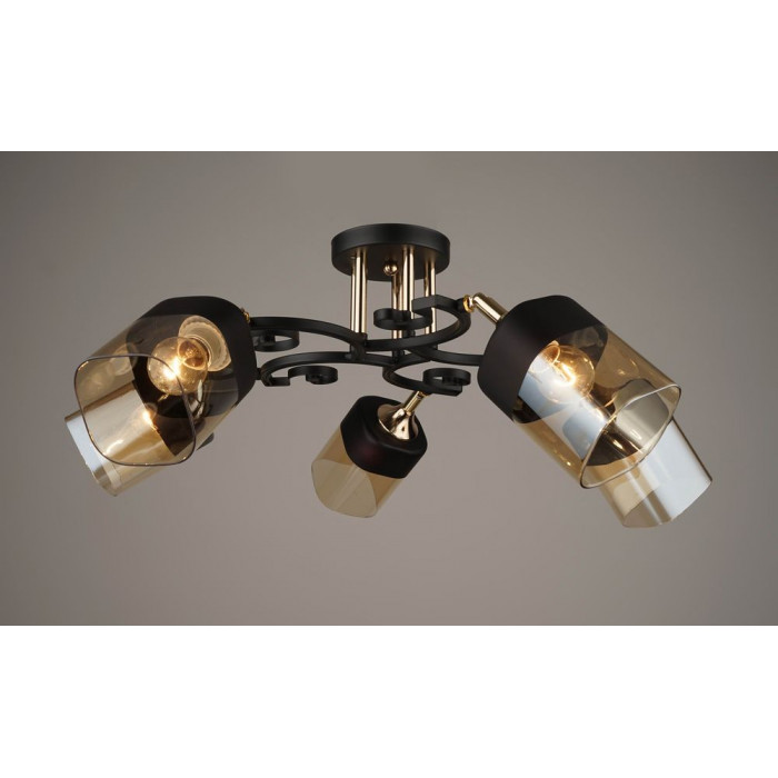 П’ять джерел світла, кожне — окрема точка акценту. Поворотні плафони дозволяють направити світло саме туди, де воно потрібне: на робочу поверхню, зону відпочинку чи декоративний елемент. Чорний металевий каркас із золотими деталями виглядає як графічна лінія — чітка, елегантна, з характером. Скляні абажури з градієнтним затемненням додають глибини, а тепле світіння створює атмосферу затишку.