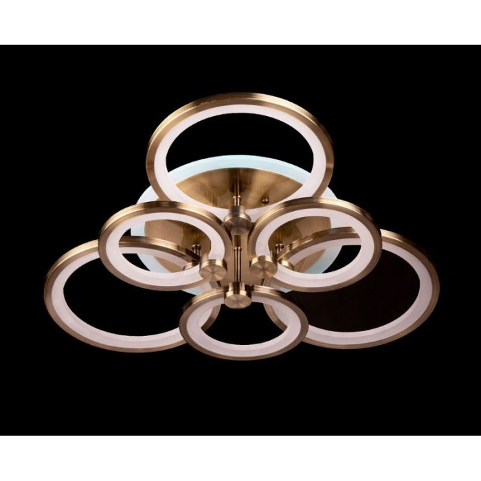 Конструкція поєднує міцний металевий каркас у кольорі бронза та акрилові світлові елементи, які формують ефектний геометричний дизайн із кільцями.