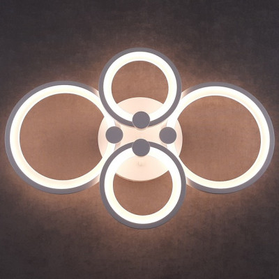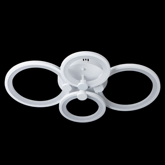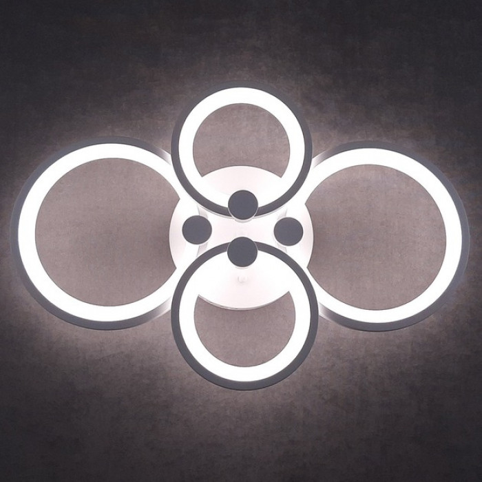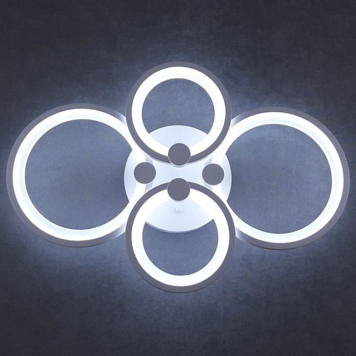 Світлодіодна люстра з чотирма кільцями — сучасне освітлення для просторих приміщень. Модель виконана в стилі хай-тек, має білий металевий каркас і акрилові плафони, що забезпечують рівномірне розсіювання світла. Потужність 112 Вт дозволяє ефективно освітлювати вітальню, спальню, студію чи офіс.