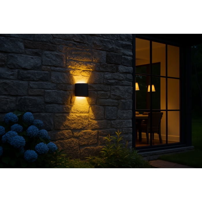 Світильник має подвійне направлення світла – вгору та вниз, що забезпечує не лише функціональне освітлення, але й декоративний ефект. Матовий чорний корпус з якісного пластику добре вписується у сучасний екстер’єр.