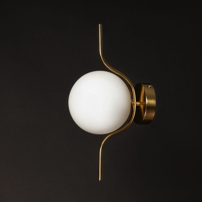 Це настінне бра — витончене світлове рішення для тих, хто цінує лаконічність і характер. Його вертикальна композиція з металевими дугами золотого кольору створює візуальний ритм, а сферичний скляний плафон ніби зависає в центрі, мов світлова крапля в просторі.